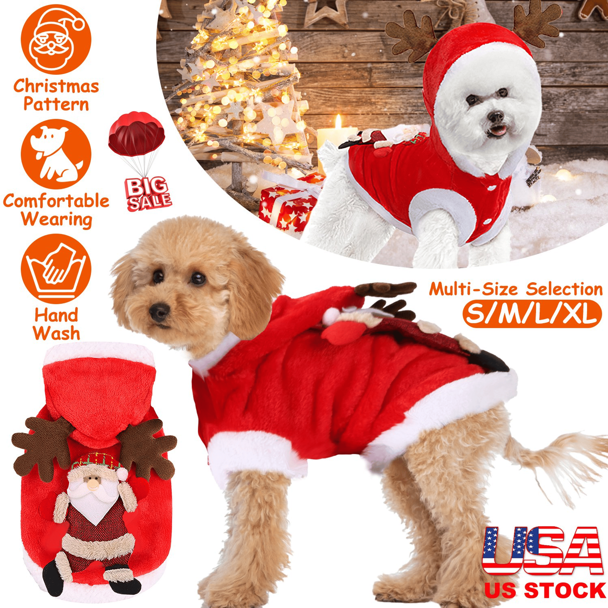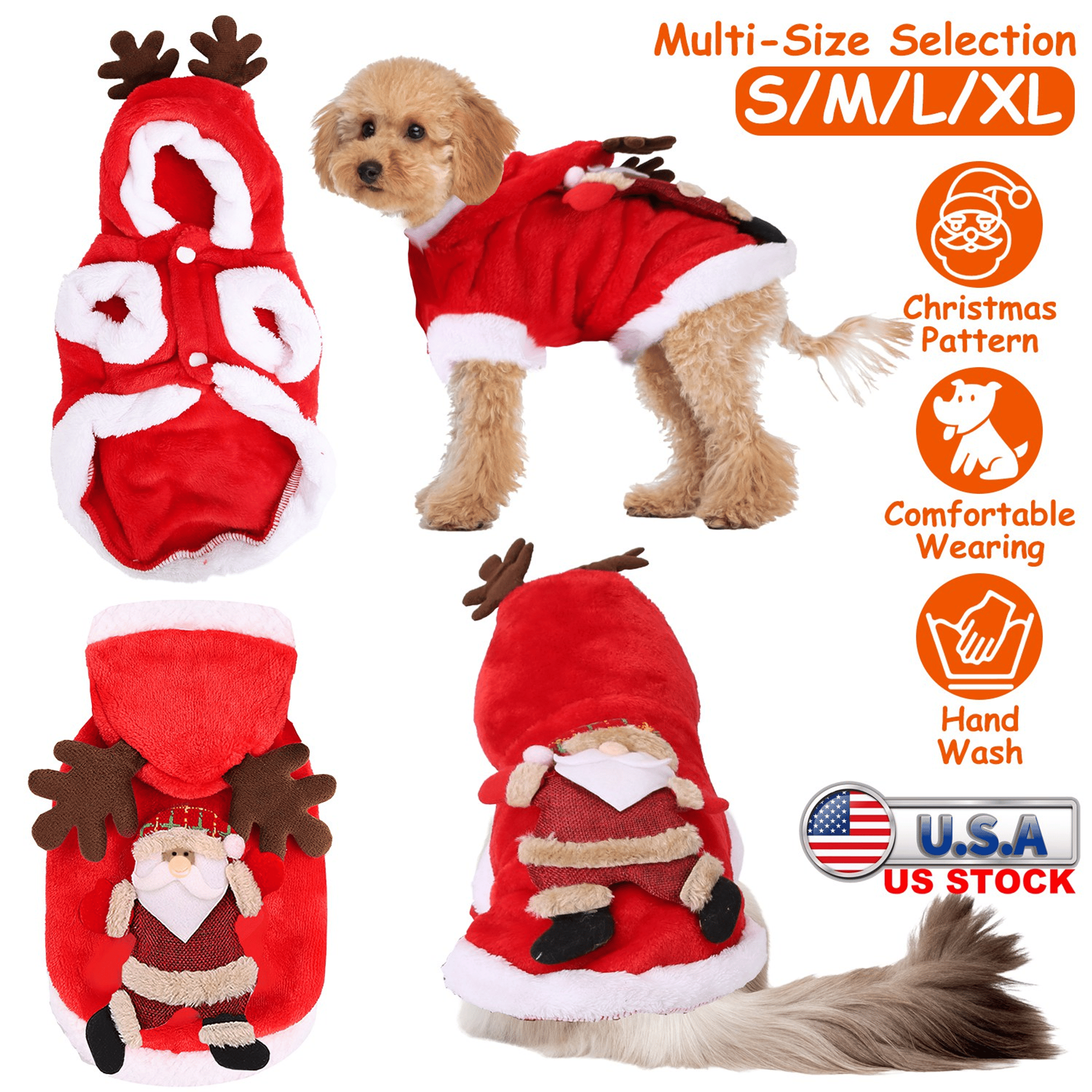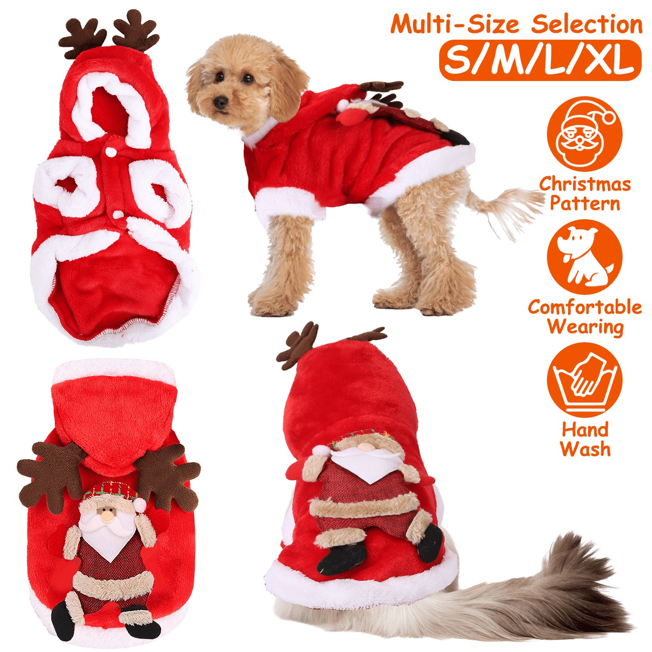 Buy you furry friend a stylish and cute costume to cheer up the coming Christmas! Our pet clothes come with S/M/L/XL four sizes, fit for different figures of pets weigh from 3.31lbs to 12.12lbs. Designed with classic color matching, cute Santa Claus pattern and tridimensional antlers, you will receive much praise and admiration when you take your pet for party and walk. Soft and skin-friendly material provides comfortable wearing experience, without restrained. Perfect gift for your lovely pet in this winter.