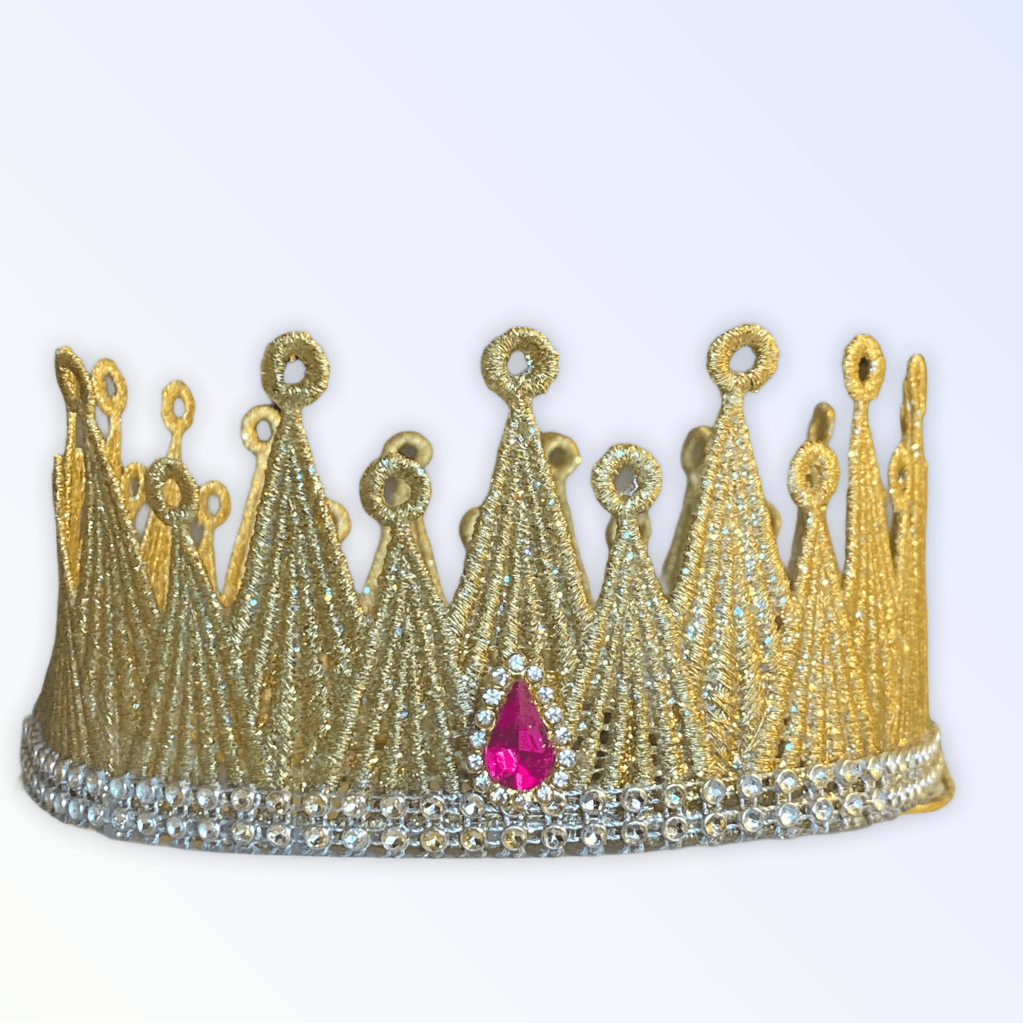 This crown has ALL the glitz and glam! Soft gold lace featuring gorgeous rhinestone trim and a beautiful pink gem in the middle.An elastic tie is attached to stay in place on your pup's head.For proper fit, please measure around your pup's head.Size suggestions by breed:XS- 6-8" Yorkie and ChihuahuaS- 9-11" Dachshund, Pekingese, Pomeranian, Shitzu M- 12-14" PoodleL- 15-17" Pug, French Bull DogXL- 18-20" Lab, Pitbull, Mastiff