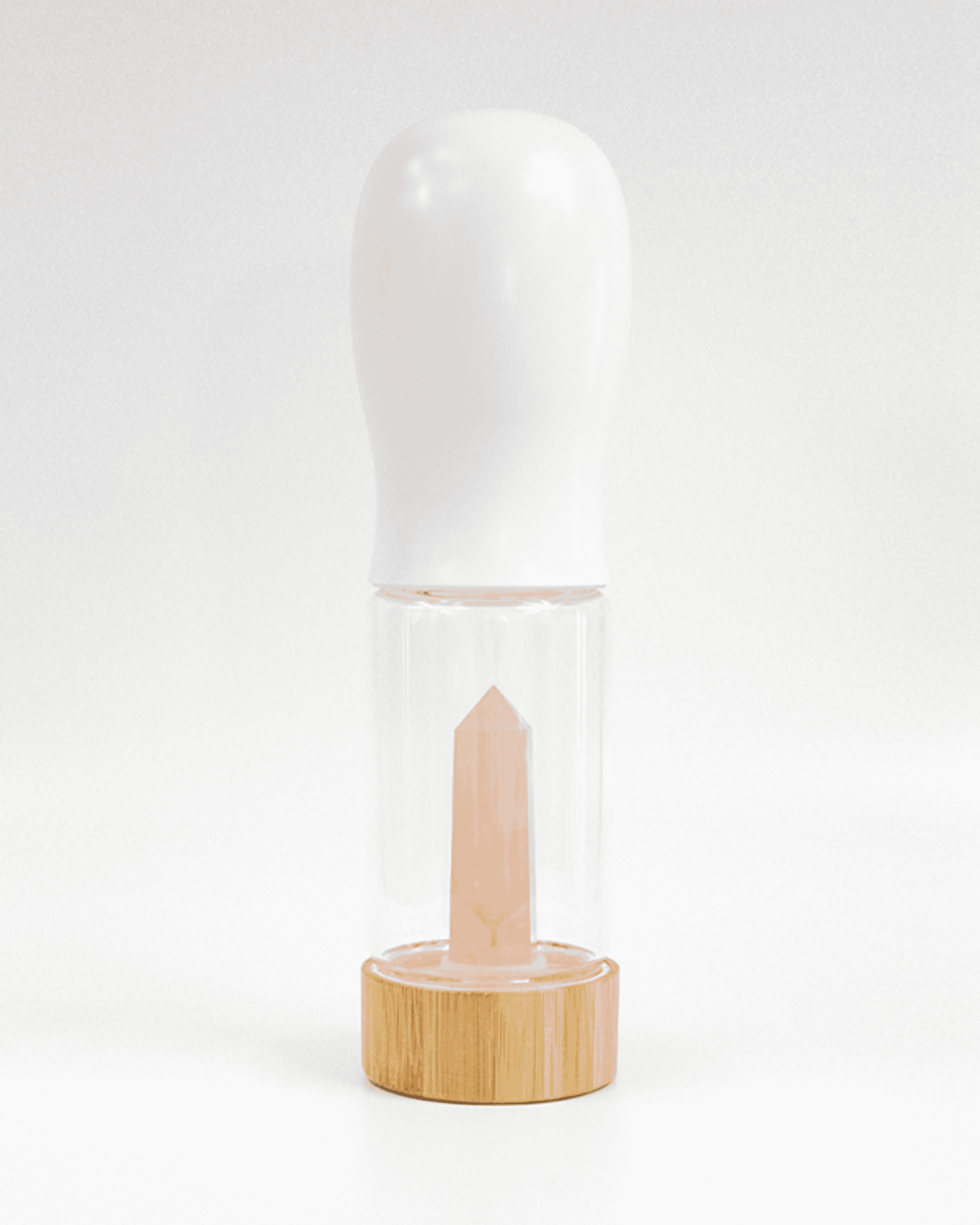 At the center of this finely crafted bottle lies the Rose Quartz. Known to crystal enthusiasts as the crystal of compassion, tranquility, and unconditional love.