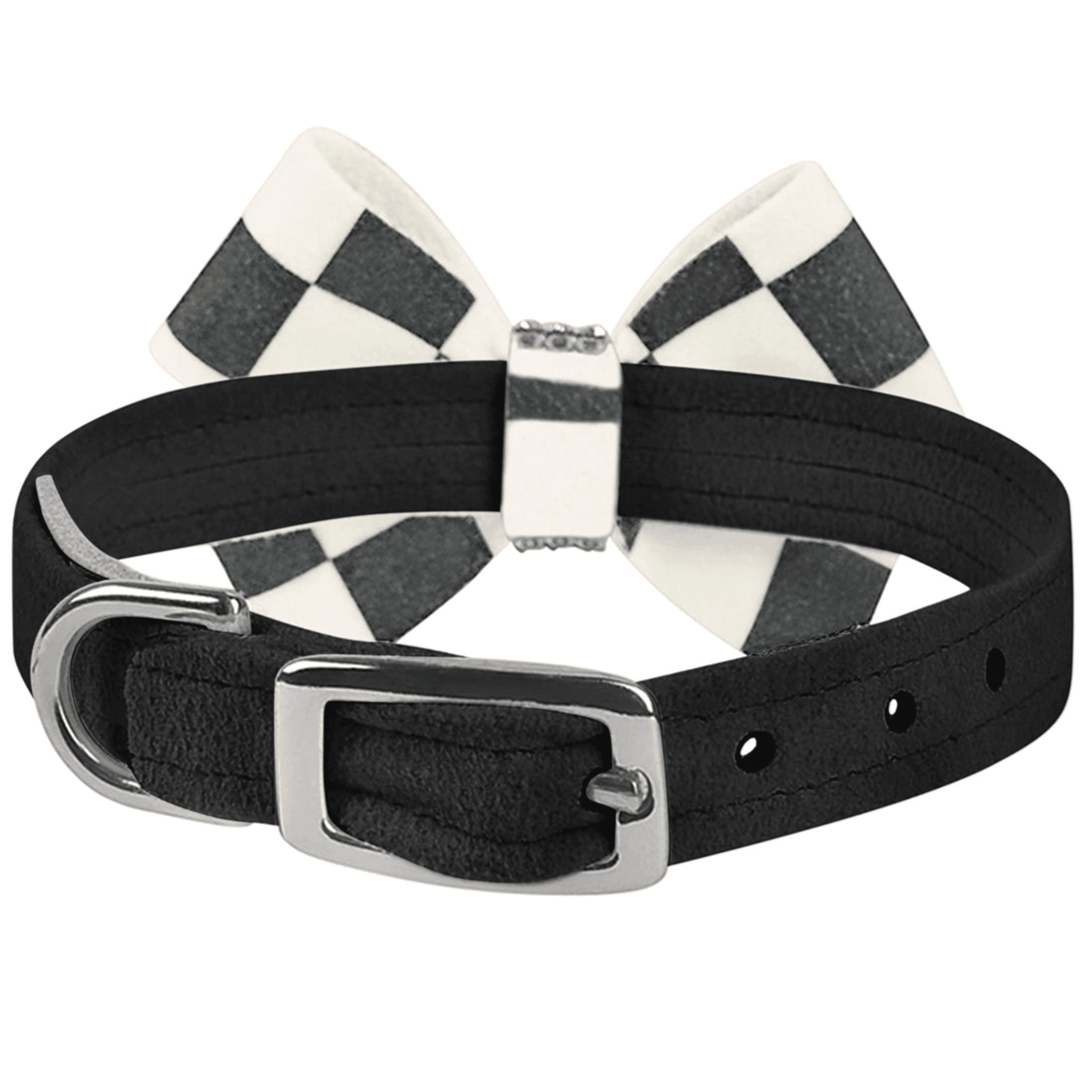This collar has a premium look and feel, while being easy for you to maintain. Made from Ultrasuede fabric with the soft texture and feel of premium suede. Ultrasuede offers the highest grade of durability, making this collar resistant to stains and discoloration, it is even machine washable! The Windsor Check Nouveau Bow captures all attention with bold curves in cream and charcoal check patterning embraced by rows of the world's finest crystals made in Europe. We recommend your dog should always be walked with a harness. Our collars are designed for ID tags, charms and for decoration, they are NOT designed for pulling dogs. Collar width is 0.5". Manufactured in the USA