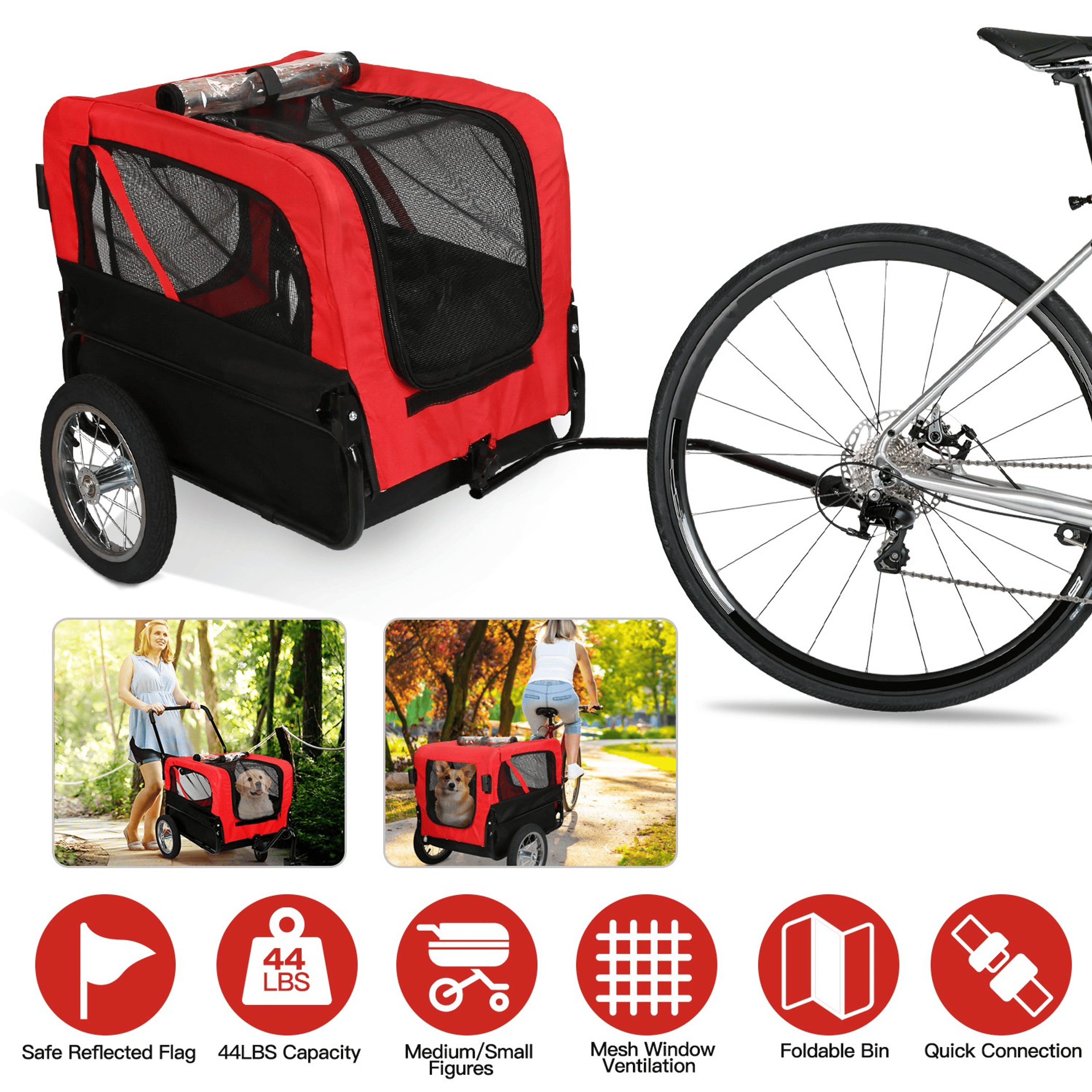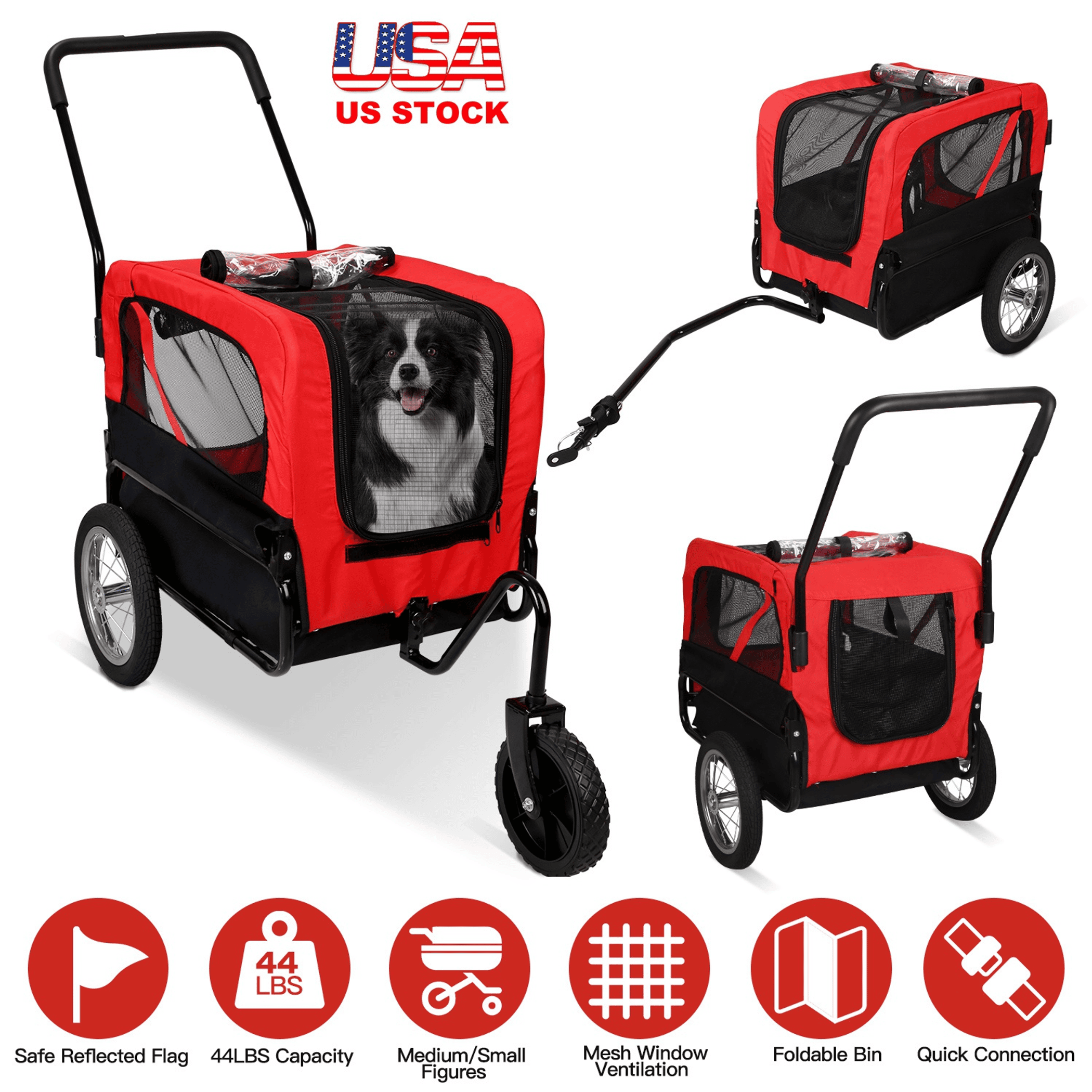 Do you want to take your furry friend for a new, far outdoor adventure? Our 2-in-1 pet bicycle trailer with cargo bin size of 16.53x23.22x19.29in provides your pet spacious room and safe experience. Designed with front and back entrance with double zippers, allow your pet to easily access, plastic cover on the front door keeps rain, snow, debris and dust away. Both sides of mesh window ensure great air ventilation and keep your dog cool. Besides, the anti-skin and durable wheels enable smooth movement on different floors. Constructed with solid iron structure and wear-resistant oxford cloth, this pet trailer can hold up to 44lbs capacity, suitable for small and medium sizes of dogs and cats.